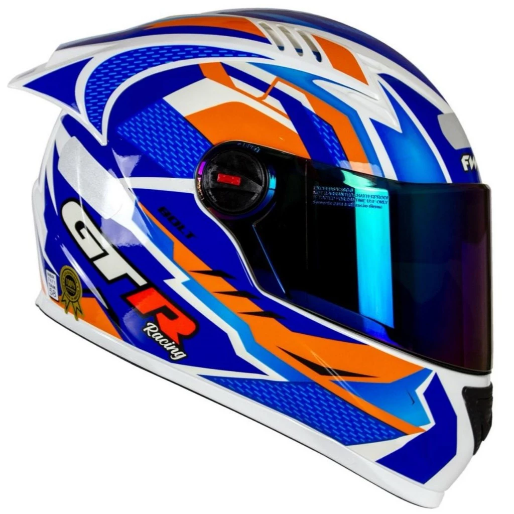 Experimente o Capacete FW3 GTRacing Bolt Branco com Azul e Laranja e sinta a diferença em conforto, estilo e segurança!